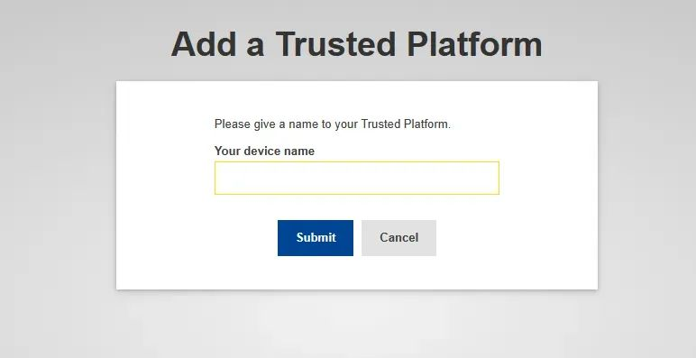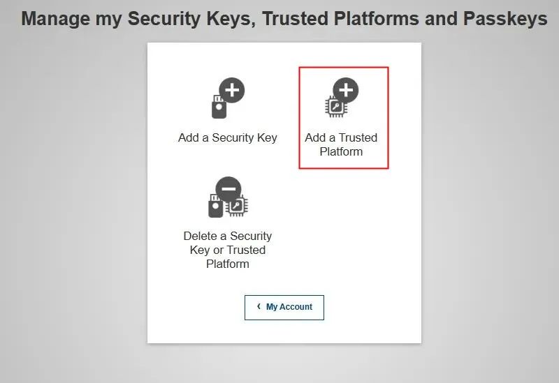 打开“My Account”,选择“manage my security keys and trusted platforms”,之后选择“Add a trusted Platflorm”。