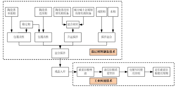 将纳米陶瓷基高温防氧化涂层材料喷涂在铝电解槽的阳极炭块侧表面,加热到400°C时,涂层材料晶粒收缩,晶粒间隙小于气体分子直径,形成坚固致密的陶瓷基隔绝层,可阻止周围的高温空气、二氧化碳和电解质蒸汽对阳极炭块的氧化侵蚀,实现炭块的隔绝保护。在恒定的电流强度下,与无涂层阳极相比,涂层阳极的使用寿命延长1~1.5天。工艺流程如图4所示。