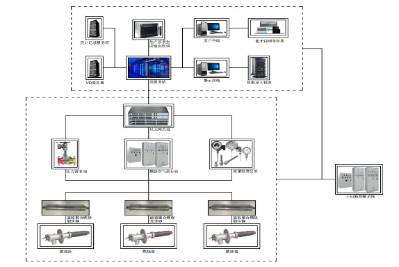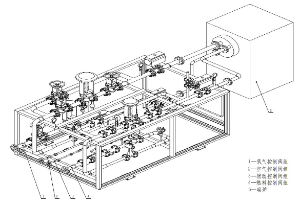 设计优化窑炉助燃系统,利用氧气代替空气助燃,通过氧气增压、输送阀门控制器,动态控制一、二次氧输入比例。控制器采用可编程逻辑控制模式,可实现自动点火、燃料和氧气精确配比、燃烧过程可控等功能。火焰长度可调、燃烧充分,且没有氮气参与燃烧造成的热能浪费和氮氧化物排放。设备结构如图5所示。