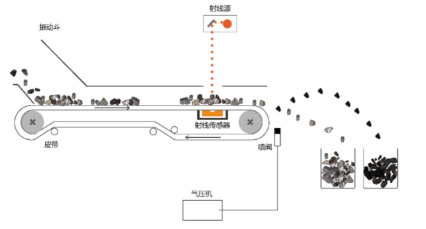 原矿在通过皮带传输或进入环形入料口自由落体时采集多种光线进行穿透照射成像。图像进入计算机人工智能系统分析识别,识别数据用于精准捕捉矿石位置和控制喷阀打击矿石,使其落入相应区域,以完成分选过程。整个分选过程只需几毫秒,每秒可处理3000~10000颗矿石的全自动分选。装备原理如图2所示。