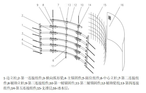 采用弧形墙体结构,主体包括内凸式弧形装配式骨架、钢筋网层和土工织物脱水封闭层3层。利用拱结构原理,构建弧形钢骨架作为主要受力单元。弧形钢梁可以适应微小变形,将所受载荷传导至两侧岩体,充分发挥结构自承载能力,有效提高墙体整体稳定性。弧形钢梁能够完全替代钢筋混凝土挡墙,降低水泥用量。充填挡墙结构如图3所示。