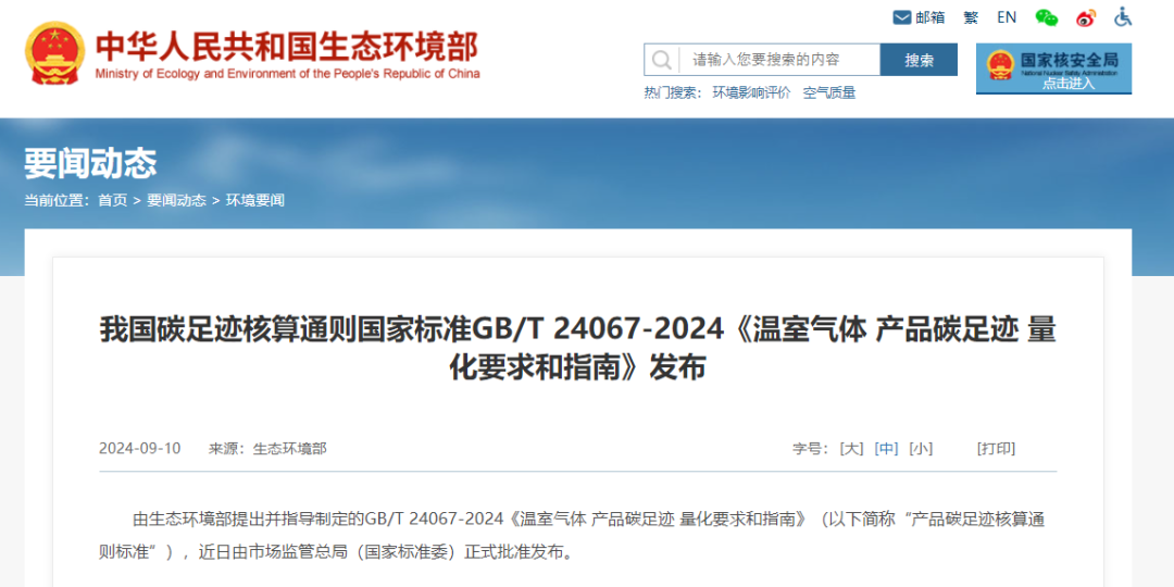 由生态环境部提出并指导制定的GB/T 24067-2024《温室气体 产品碳足迹 量化要求和指南》(以下简称“产品碳足迹核算通则标准”),近日由市场监管总局(国家标准委)正式批准发布。