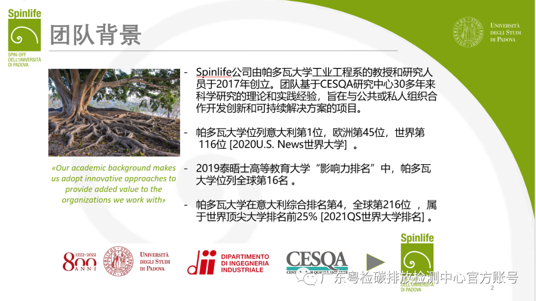 2021年7月28日,广东粤检碳排放检测中心(以下简称“粤检碳排中心”)通过线上视频会议方式与意大利Spinlife公司就项目合作建设、共建科研中心、信息互通共享、课题联合开发、产品认证服务、人才联合培养六个方面进行探讨,双方对今后加强合作达成共识。粤检碳排中心CEO、郭浩桦、吴俊章;意大利Spinlife公司主席Antonio Scipioni教授、合伙创始人Alessandro Manzardo教授及Riccardo Losa参加了此次视频会。会上,粤检碳排中心就公司创办历程、核心业务和产品服务进行交流,并表示粤检碳排中心将专注于我国温室气体排放控制,推动经济发展方式向绿色低碳转型,以政策为导向、市场和客户需求为驱动,以智库咨询为统领,以科研技术为载体,以项目实施服务为助力,为政府和企业客户提供咨询、支持及报告认证服务。在全球碳达峰、碳中和骤然升温背景下,在我国发展全局重大决策部署下,粤检碳排中心与意大利Spinlife整合优势促进合作,同时准确把握我国行业、企业“双碳”目标、低碳转型路径及碳减排要求,以自身优势助力与意大利Spinlife把握绿色低碳新机遇,迎接新挑战,努力推动高质量发展。意大利Spinlife介绍了公司业务和科研发展情况,多年来始终坚持将环境或可持续科学知识应用于一切人类活动,并为客户提供一系列可持续发展模板的创新模式。同时,还表达了愿同粤检中心达成战略合作伙伴关系,充分发挥自身人才、技术、科研项目等优势,围绕公司高质量发展战略需求目标,双方将整合资源优势共同探索并创造更多互补性增长的机遇,携手开拓更广领域。意大利Spinlife公司是由帕多瓦大学工业工程系Antonio Scipioni和Alessandro Manzardo等教授和研究人员共同创立,旨在与ISO、联合国环境署等国际组织、机构和欧美、中国等十多所名牌大学合作的基础上,定期为学术和认证机构提供会议组织、科学研究、课程培训等服务。Spinlife团队基于帕多瓦大学CESQA研究中心30多年来科学研究的理论和实践经验,致力于与公共或私人组织合作制定实施与环境可持续性相关的战略解决方案,同时将促进学术界的最新研究成果应用于企业界,为企业和学术界之间架起一座沟通桥梁。