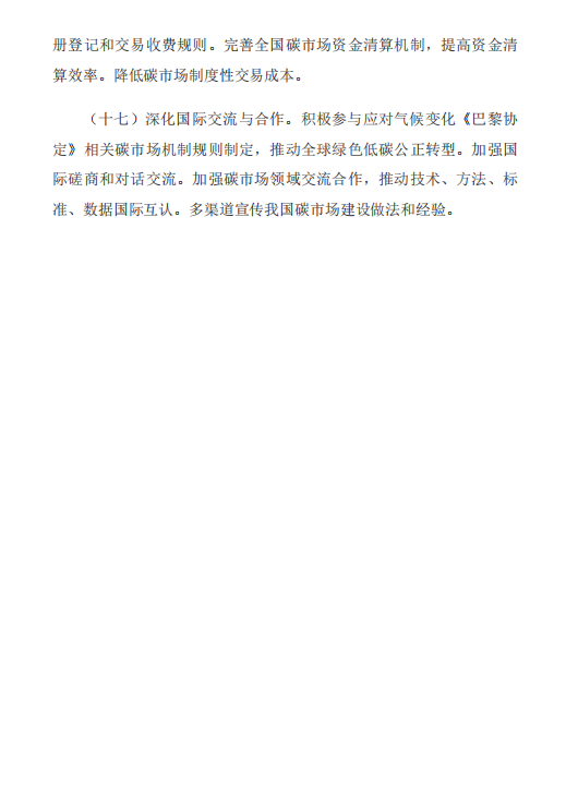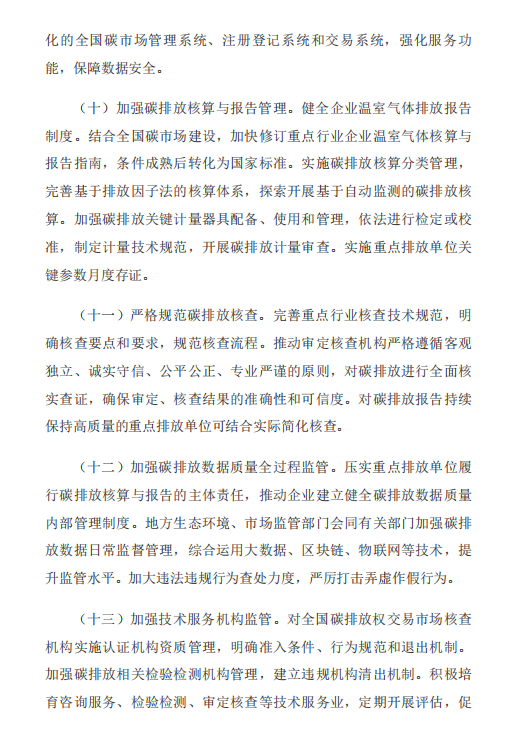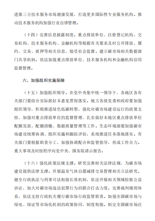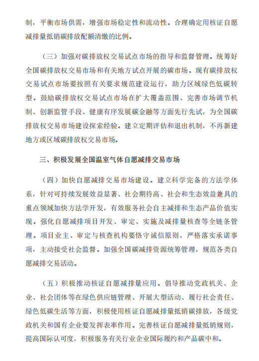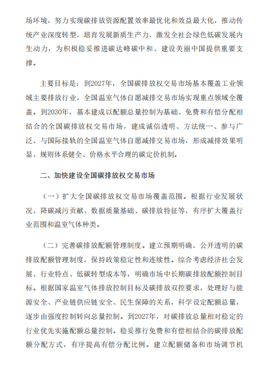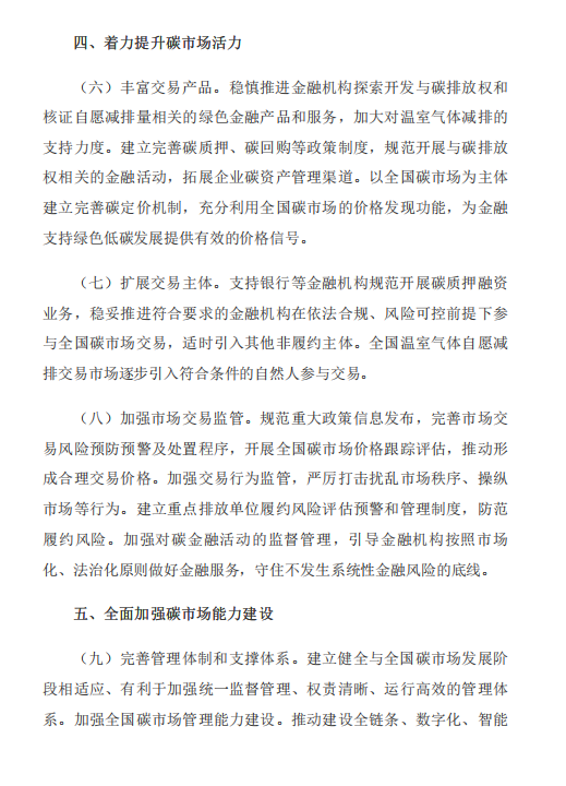 《意见》包含总体要求、加快建设全国碳排放权交易市场、积极发展全国温室气体自愿减排交易市场、着力提升碳市场活力、全面加强碳市场能力建设、加强组织实施保障6部分内容。