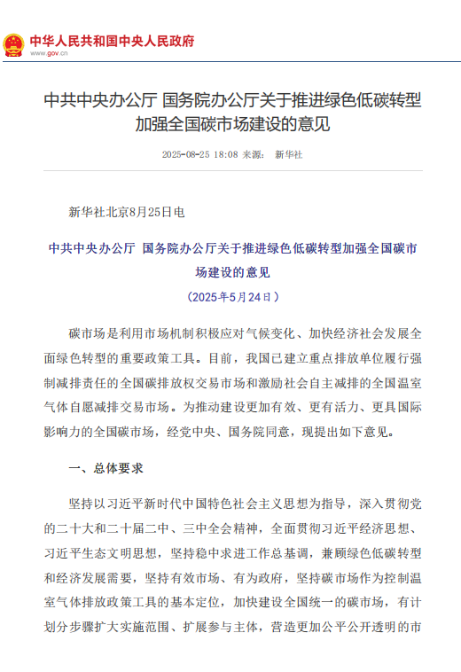近日,中共中央办公厅 国务院办公厅印发《关于推进绿色低碳转型加强全国碳市场建设的意见》(下称《意见》)。