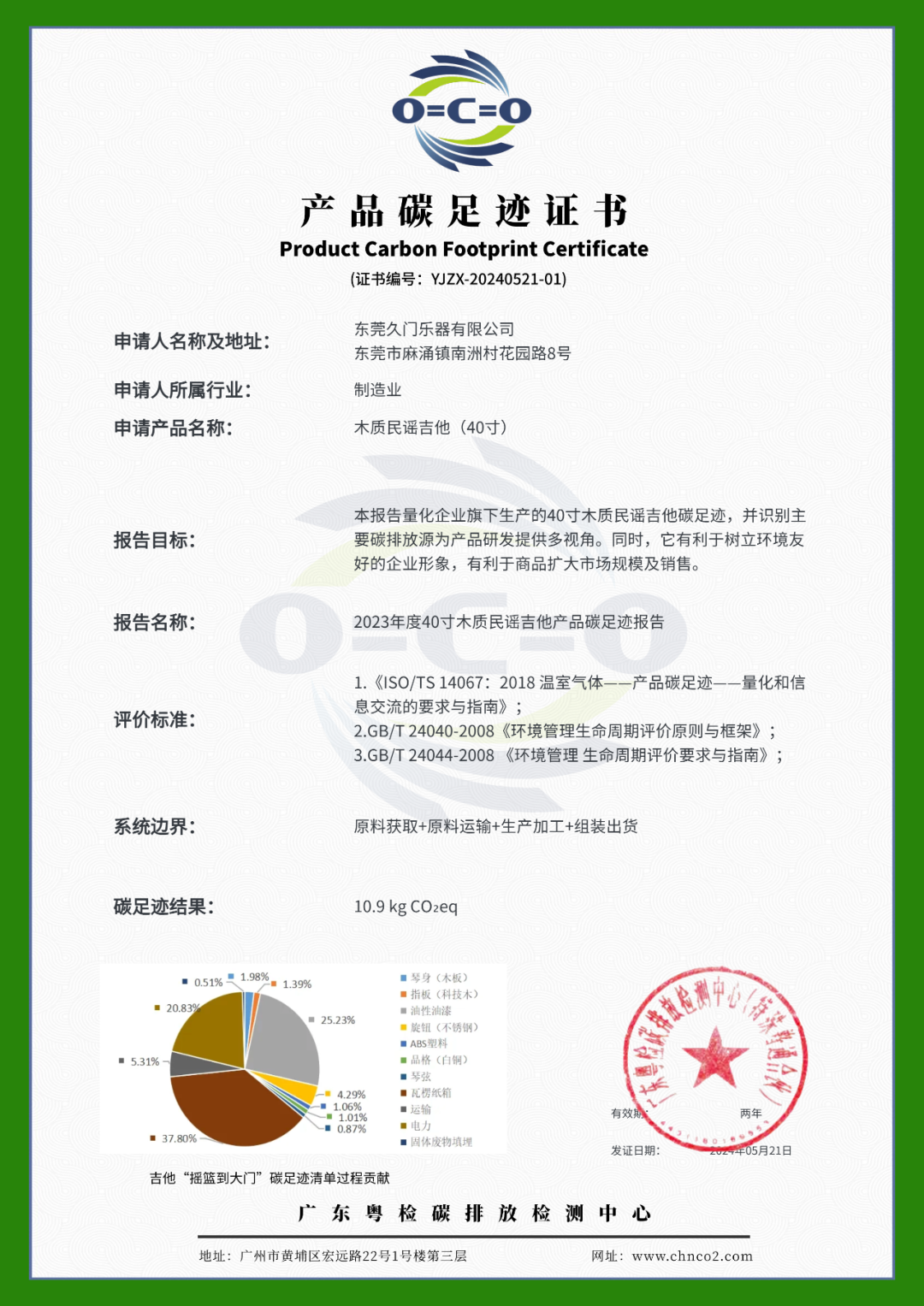 东莞久门乐器有限公司重视市场环境的趋势,战略布局,委托粤碳中心基于ISO 14067、GB/T 24040-2008、GB/T 24044-2008标准量化其从吉他原材料获取、生产加工组装系统边界内的一件