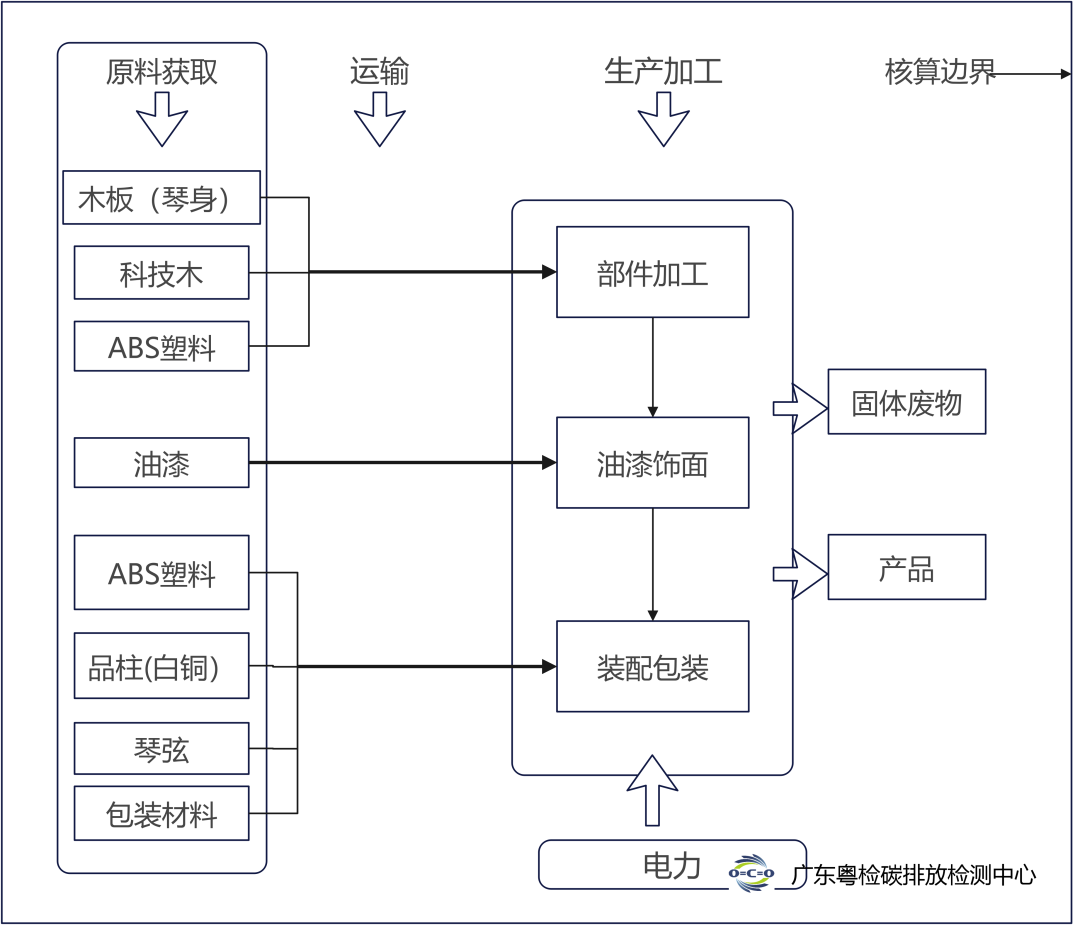 本项CFP报告,吉他在使用阶段没有能源的消耗,且吉他废弃处置阶段数据无法获取,本系统核算边界为吉他“摇篮到大门”的生命周期,主要包括原材料生产(获取)、产品生产阶段。