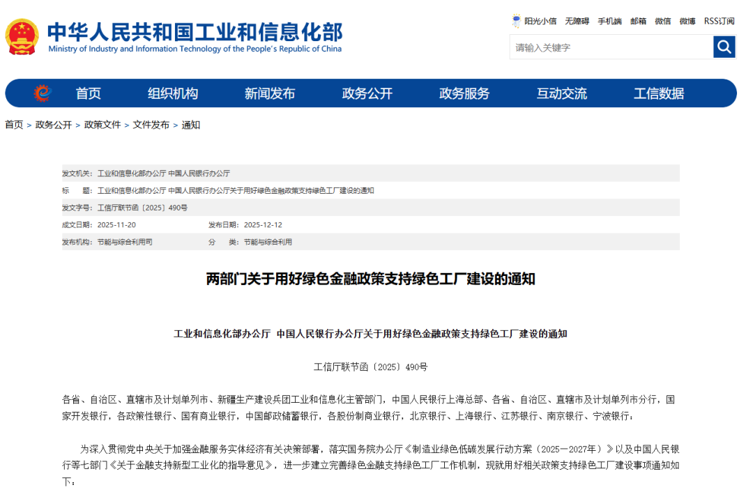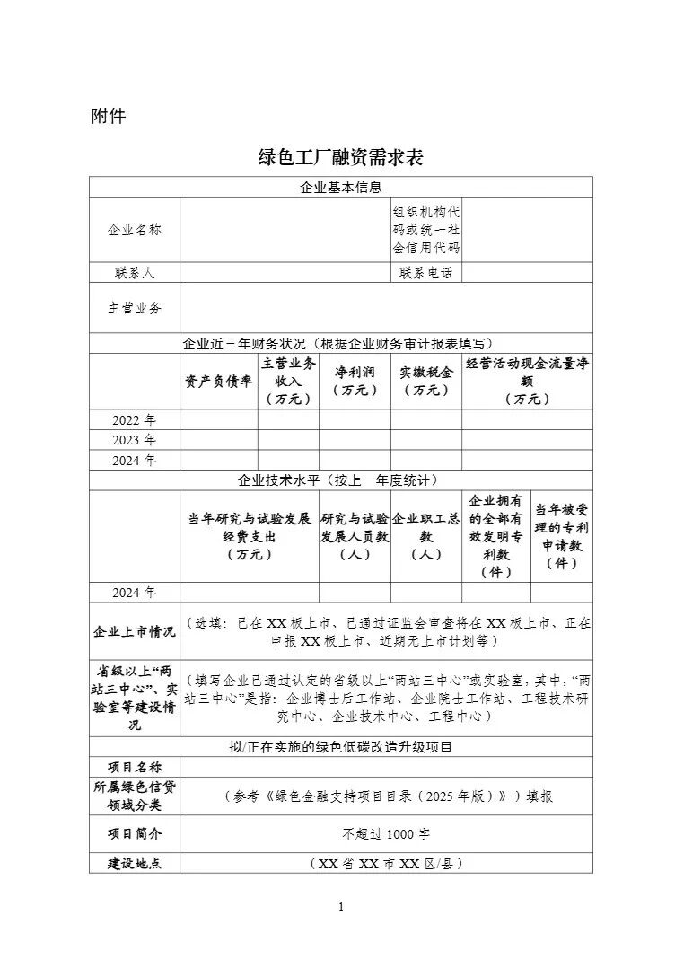 为深入贯彻党中央关于加强金融服务实体经济有关决策部署,落实国务院办公厅《制造业绿色低碳发展行动方案(2025—2027年)》以及中国人民银行等七部门《关于金融支持新型工业化的指导意见》,进一步建立完善绿色金融支持绿色工厂工作机制,现就用好相关政策支持绿色工厂建设事项通知如下: