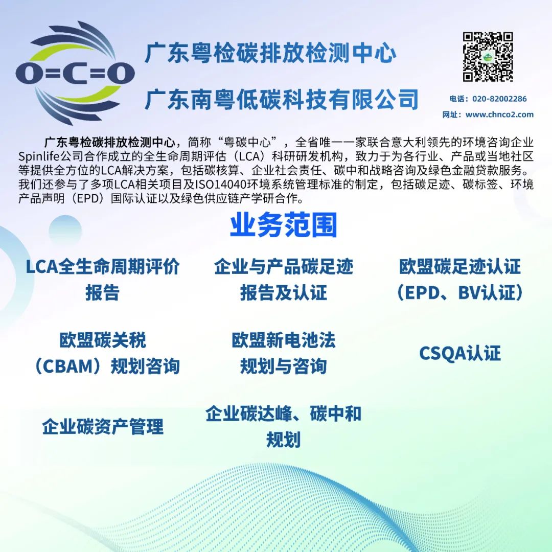 粤碳中心专注于为客户提供高质量、专业化的LCA服务,致力于推动中国可持续发展的实践。我们的专家团队将竭诚为您提供最优质的服务,与您携手共创绿色、可持续的未来。